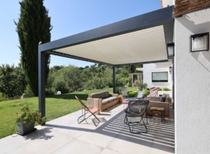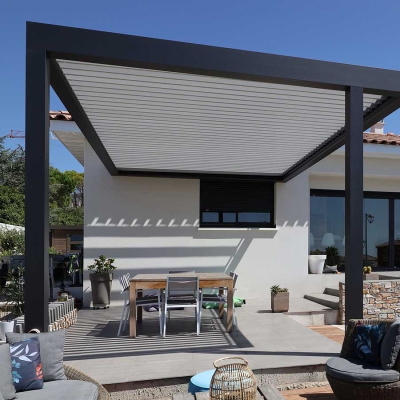 - La pergola bioclimatique, solution haut de gamme, s’adapte aux conditions météo grâce à ses lames orientables qui régulent l’ensoleillement, favorisent la ventilation naturelle et protègent de la pluie.